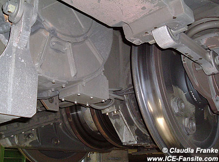 Blick in das Drehgestell eines Triebkopfes. Links der Fahrmotor, rechts die Scheibenbremsen (2004)