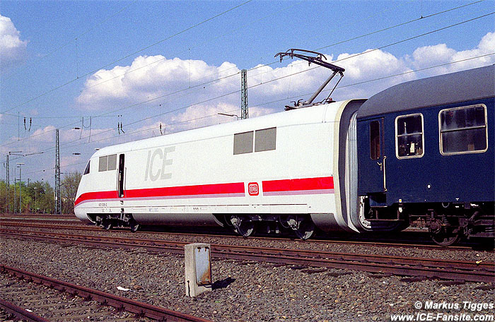 401 006 mit ICE „Dummy-Zug“ bestehend aus ausgemusterten D-Zug Wagen mit für 200kmh zugelassenen Drehgestellen, wird am 05.04.1990 zur Meßfahrt vorbereitet |