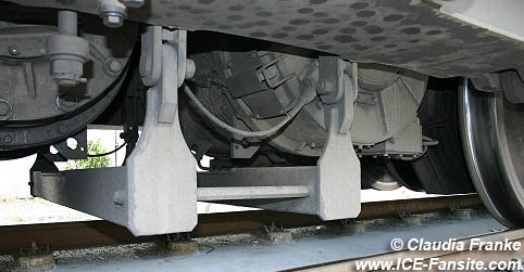 Die Antriebs-Bremseinheit ist entsprechend der erfolgreichen UmAn-Ordnung in der Mitte des Wagens. Der gesamte Antriebsblock ist am Drehgestell-Kopfträgern gelagert. Diese Anordnung wurde bereits im ICE-V erprobt. Diese Anordnung ermöglicht, dass die Antriebsmassen weitgehend abgefedert sind. Der Fahrmotor und das Getriebe mit einseitigem Kardan-Hohlwellenantrieb sind zu einem Block zusammengefasst. Der gesamte Block ist zum einen am Fahrzeugkasten und zum anderen über Pendel am Drehgestellrahmen aufgehängt. Die über Zug-Druckstangen angelenkten Triebgestelle gewährleisten ein günstiges Verschleißverhalten. Zudem werden die Instandhaltungskosten deutlich reduziert. Zug- und Druckstangen sowie die Fahrmotoren besitzen eine Notaufhängung. Auf den Hohlwellen sind jeweils zwei Bremsscheiben angebracht. Links im Bild zu sehen sind zwei Fahrmotoren am Triebkopf und darunter die Notaufhängungen.