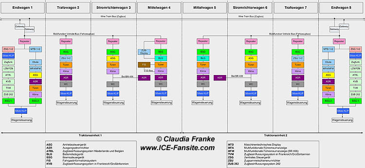 Die Kommunikation dieser Komponenten innerhalb einer Traktionseinheit erfolgt über den MVB. Über Repeater wird die Verbindung von Wagen zu Wagen zum nächsten MVB hergestellt. In den Endwagen ist der MVB über das ZSG mit dem Zugbus WTB verknüpft. Das WTB verbindet alle Traktionseinheiten und Endwagen.